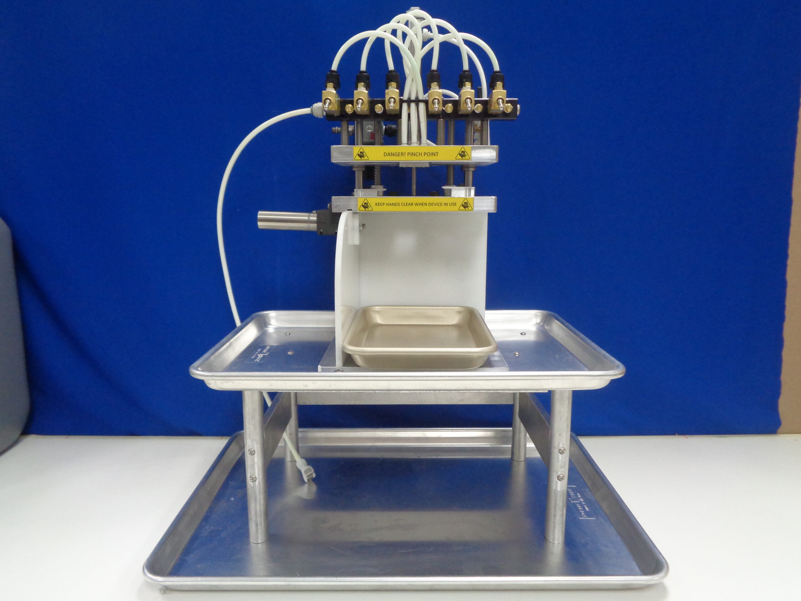 - Pump is turned on and the valve to the first nozzle is opened. Visual inspection of the underside of the head while fluid is flowing will determine if obstructions are present. Pump runs for 30 sec to 2 minutes depending on nozzle clarity. If there are deflected and/or missing streams, a foam tip applicator can be used to gently scrub the surface at the streams exit point.