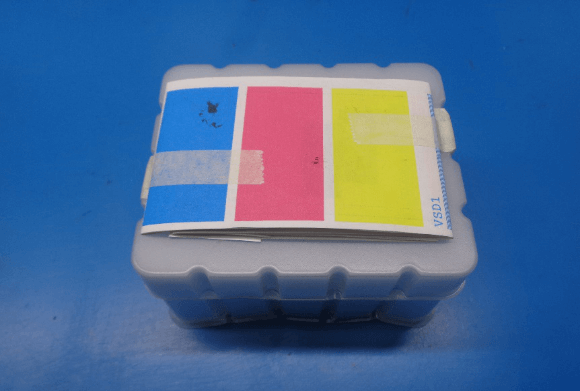 - Put the clean head in an “eggshell” container (the plastic box that was saved earlier) and tape it closed.