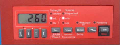 - Output of fluid is set to 260 mL/min (This number can be set higher but runs the risk of “blowing out” the head. 350 mL/min is the soft upper limit, exceed at accelerated risk to print head)