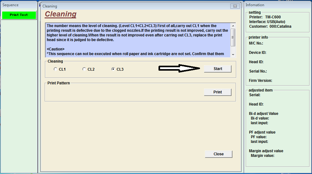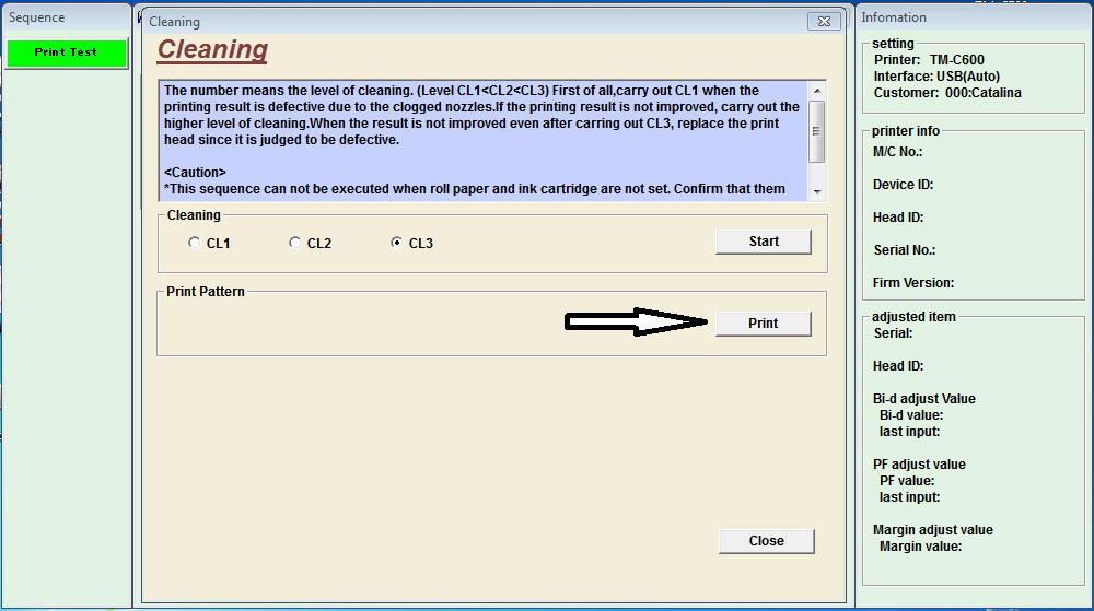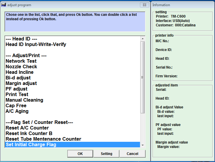 - Print head is installed into a tester printer. By resetting the Initial Charge Flag, an initial charge can be performed. This will remove all the CR02 from the head and replace it with ink. When the charge has completed, a nozzle check is printed out. If the nozzle check is good, a final test print is done. If the final test print is good, the head is removed from the printer and goes to the next process.