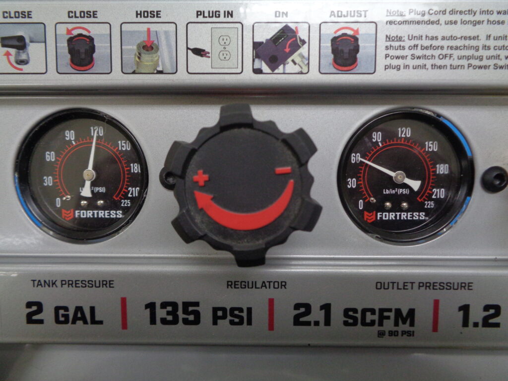 Follow directions for the air compressor for the first-time startup. Once it is powered up, adjust the OUTLET PRESSURE to 60 psi
