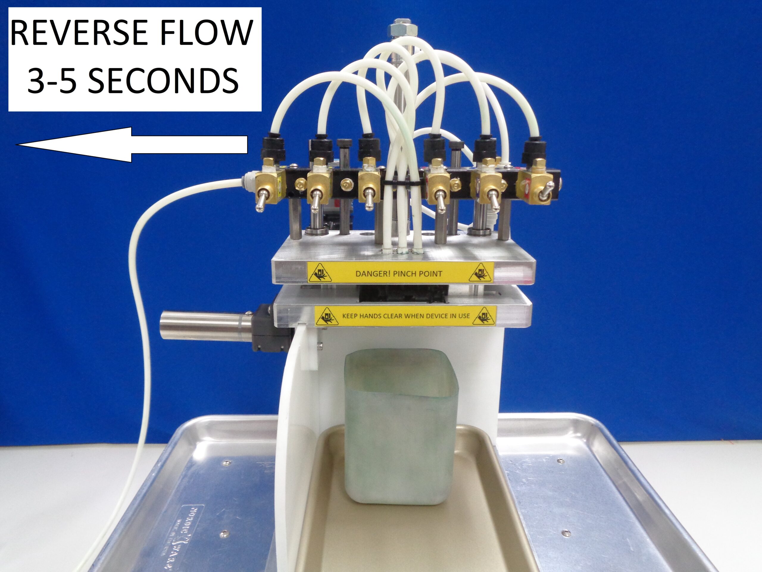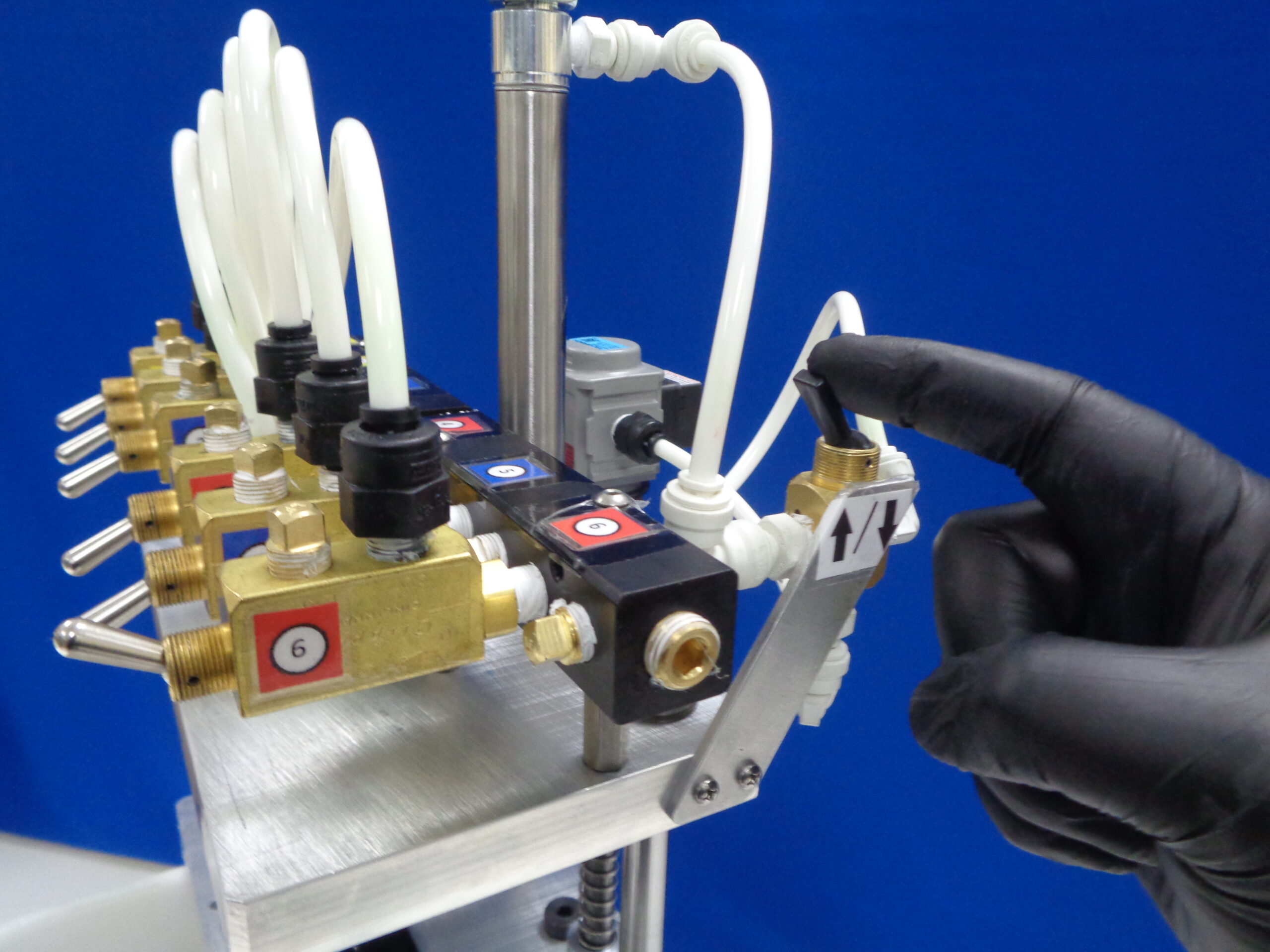 - Pump is turned on and the valve to the first nozzle is opened. Visual inspection of the underside of the head while fluid is flowing will determine if obstructions are present. Pump runs for 30 sec to 2 minutes depending on nozzle clarity. If there are deflected and/or missing streams, a foam tip applicator can be used to gently scrub the surface at the streams exit point.